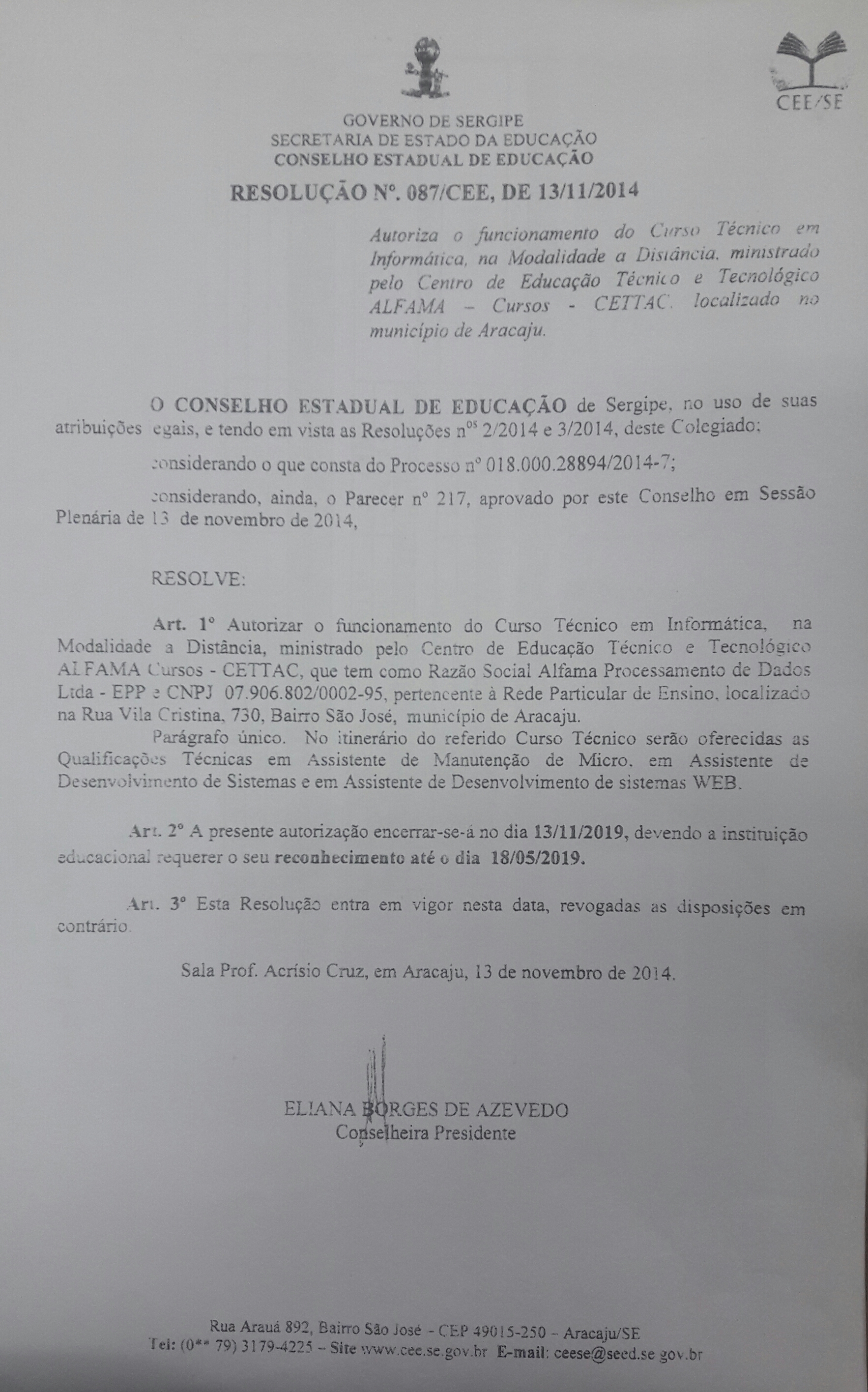 Com qualificações em Manutenção de Micro, Desenvolvimento de Sistemas para a Internet. Reconhecido pelo Conselho Estadual de Educação, Resolução nº 157/CEE, de 09/06/2016.